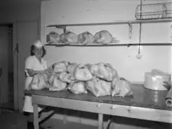 Turkey was eaten in as early as the 16th century in England.[10] Before the 20th century, pork ribs were the most common food for the North American holidays, as the animals were usually slaughtered in November. Turkeys were once so abundant in the wild that they were eaten throughout the year, the food considered commonplace, whereas pork ribs were rarely available outside of the Thanksgiving–New Year season.[11] While the tradition of turkey at Christmas spread throughout Britain in the 17th century,[10] among the working classes, it became common to serve goose, which remained the predominant roast until the Victorian era.[12]