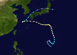 Typhoon Pat developed from the Monsoon Trough situated to the east of Taiwan on August 27. Pat quickly was upgraded to tropical storm status and was named. Due to a probable Fujiwhara Interaction between Pat and Typhoon Odessa, Pat moved toward the northeast. Just before making a turn towards the northwest Pat was upgraded to a typhoon on the 28th. Typhoon Pat began to accelerate in the direction of Japan. Pat made landfall on southern Kyūshū on the 30th before accelerating through the Sea of Japan and turning extratropical. Pat killed 23 people through Kyūshū and Hokkaidō and destroyed 3,000 homes.[13]