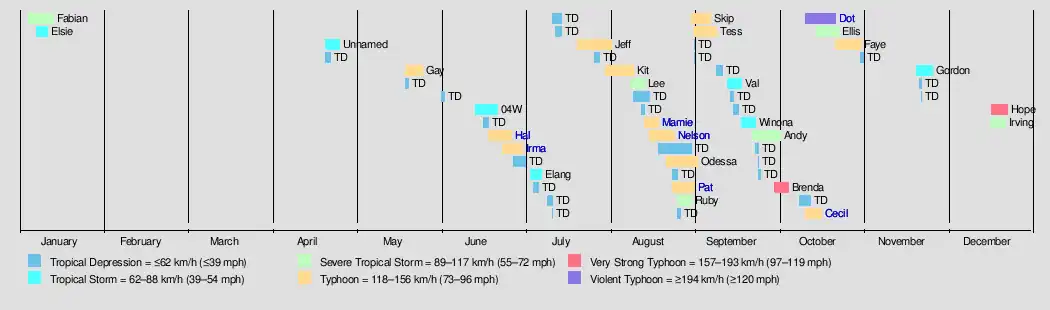 A total of 29 tropical depressions formed this year in the Western Pacific, of which 28 became tropical storms. 17 storms reached typhoon intensity, of which 1 reached super typhoon strength. Only four tropical cyclones moved through the Philippines this season, while eight moved into China, three moved into Vietnam, and three moved into Japan. Tropical cyclones brought Hong Kong 40 percent of its annual rainfall.[1] The strongest cyclone of the season, Dot, reached category 5 on the Saffir–Simpson scale. However, it weakened slightly before moving into the Philippines at the high end of category 3 status. Typhoon Cecil was the deadliest storm of the season, accounting for nearly half of the deaths from western Pacific tropical cyclones in 1985.