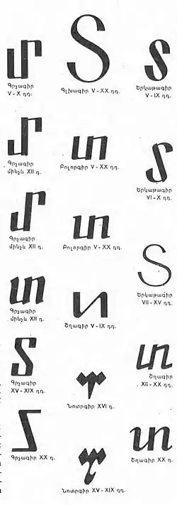 Tyun, Tyown, or Tiwn (majuscule: Տ; minuscule: տ; Armenian: տյուն; Classical Armenian: տիւն) is the thirty-first letter of the Armenian alphabet. It represents the voiceless alveolar plosive /t/ in Eastern Armenian and the voiced alveolar plosive /d/ in Western Armenian. It is typically romanized with the letter T (or D, depending on the dialect).[1] Created by Mesrop Mashtots in the 5th century, it has a numerical value of 4000.[2] The uppercase Տ is similar to the Latin uppercase S, whilst the lowercase տ is like a ligature of the lowercase u and n.