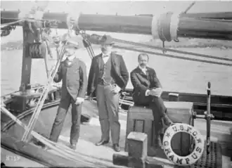 Grampus completed her cod collection duties off Massachusetts for the season in May 1890.[54] From 3 July to 25 August 1890, she resumed the work of recording water temperatures and weather off southern New England she had begun in the summer of 1889, this time joined in the effort by the United States Coast and Geodetic Survey survey steamer USC&GS George S. Blake and observers stationed aboard the Nantucket South Shoals Lightship.[52][53] Grampus again collected brood cod over the winter of 1890–1891.[55] From 5 May to 18 June 1891, she again investigated the mackerel fishery off the U.S. East Coast between Massachusetts and Delaware, continuing the inquiry into how weather and water temperature influenced the seasonal movements of mackerel.[56] Following that, she operated off southern New England for the third consecutive summer, from 30 June to 1 September 1891, to continue the study of vertical water columns and weather begun in 1889, this time operating only with the support of personnel embarked on the lightship.[57][58] On 5 September 1891, Grampus was on a voyage from Hyannis, Massachusetts, to Woods Hole with U.S. Commissioner of Fisheries Marshall McDonald and his wife and daughter, Assistant U.S. Fish Commissioner J. W. Collins (her former captain), and two female guests aboard when she ran aground on L'Hommidieu Shoal in Vineyard Sound during a southeasterly storm. McDonald, Collins, McDonald's family members, and the other two women made it safely to Falmouth, Massachusetts, in a dory, and Grampus later was refloated and returned to service.[59]