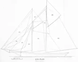 To address these issues, Grampus, although similar in design to the traditional New England schooner, also differed in significant ways.[4] She had a hull 18 to 24 inches (0.5 to 0.6 m)[2] deeper than traditional schooners of similar length, giving her greater stability, and her beam was 6 to 10 inches (0.2 to 0.3 m) less than that of a traditional schooner.[2] She had a straight stem, rather than a raking one, and her stern was narrower and more raked, with her after portion approximating a V-shape, all changes which increased her hull length at the waterline. Her foremast was considerably shorter than her mainmast, and her rigging was designed so that she could carry a double-headed rig forward that allowed her to use a smaller jib that could be furled upon the approach of heavy weather and a fore staysail running from the foremast to near her stem. The result was a ship able to achieve higher sailing speeds, able to make more efficient use of her sails, with no need for crew members to work on her bowsprit during bad weather, and less likely to capsize in heavy seas.[4]