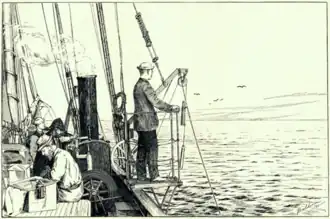 For fishing, Grampus was rigged for trawling,[11] hand-line fishing,[12] gillnetting,[13] seining,[14] dredging,[15] and squid jigging.[16] She had equipment for capturing the eggs of pelagic fishes and keeping the eggs alive or hatching them once they were aboard.[17] She also was equipped to harpoon swordfish and porpoises, with a pulpit for this purpose mounted on her jib boom end.[16] She carried guns with which her personnel could shoot birds and seals so that their carcasses could be collected for study. To collect environmental information, she carried sounding equipment and deep-sea thermometers.[18]
