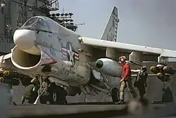 Operation Pocket Money, the mining campaign against principal North Vietnamese ports, was launched 9 May 1972. Early that morning, an EC-121 aircraft took off from Da Nang Air Base to provide support for the mining operation. A short time later, Kitty Hawk launched 17 ordnance-delivering sorties against the Nam Định railroad siding as a diversionary air tactic. Poor weather, however, forced the planes to divert to secondary targets. Coral Sea launched three A-6A Intruders and six A-7E Corsair II aircraft loaded with naval mines[8] and one EKA-3B Skywarrior in support of the mining operation directed against the outer approaches to Haiphong Harbor. The mining aircraft departed the vicinity of Coral Sea timed to execute the mining at precisely 09:00 local time to coincide with President Richard M. Nixon's public announcement in Washington that naval mines had been seeded. The Intruder flight led by the CAG, Commander Roger E. Sheets, was composed of Marine Corps aircraft from VMA-224 and headed for the inner channel. The Corsairs, led by Commander Leonard E. Giuliani and made up of aircraft from VA-94 and VA-22, were designated to mine the outer segment of the channel. Each aircraft carried four MK52-2 mines. Captain William R. Carr, USMC, the bombardier/navigator in the lead plane, established the critical attack azimuth and timed the naval mine releases. The first mine was dropped at 08:59 and the last of the field of 36 mines at 09:01. Twelve mines were placed in the inner harbor and the remaining 24 in the outer. All mines were set with 72-hour arming delays, thus permitting merchant ships time for departure or a change in destination consistent with the President's public warning. It was the beginning of a mining campaign that planted over 11,000 MK36 type destructor and 108 special Mk 52-2 mines over the next eight months. It is considered to have played a significant role in bringing about an eventual peace arrangement, particularly since it so hampered the enemy's ability to continue receiving war supplies.