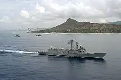 Crommelin was decommissioned ahead of schedule at a ceremony in Pearl Harbor, 26 October 2012.[3] Crommelin's last contribution was as a SINKEX target ship during the major multi-nation naval exercise RIMPAC 2016. USS Coronado attempted to hit Crommelin with the first ever LCS-launched Harpoon surface-to-surface missile. However, the weapon missed. Crommelin succumbed to multiple hits from other SINKEX participants and sank later in the evening on 19 July 2016.[4] Her final resting place is approximately 23°00′N 159°55′W / 23.000°N 159.917°W.[5]