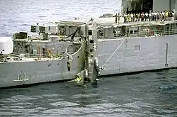 Fife's second overseas deployment began with "READIEX 83-4." Departing with the USS Ranger battlegroup on 15 July for the Persian Gulf, she alternated carrier escort duties with surveillance operations in the Gulf of Aden. While operating with the Ranger on 17 November, the Soviet guided missile frigate Razyashchiy approached the warships in what the US ships saw as a violation of international agreements for preventing collisions at sea. Fife suffered only minor damage from the resulting collision with Razyashchiy.[1] In December, Fife sailed south for a port visit in Mombassa, Kenya. While there, a cyclone passing over Agalega in the Mauritius Islands caused massive destruction. Fife, along with her SH-2F Seasprite helicopter, provided aid transferring food and water ashore. The Fife crew and the Helicopter Anti-Submarine Squadron, Light 37, Detachment 3 were awarded the Humanitarian Service Medal for their service in aid to the Agalaga inhabitants. During the return trip north, Fife intercepted the Soviet aircraft carrier Novorossiysk and performed a brief period of surveillance before rendezvousing again with the Ranger battlegroup. Relieved by the USS Midway battlegroup in January, the warships turned for home, arriving in San Diego on 29 February 1984.