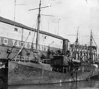 ![]() Foam prior to her U.S. Navy service, probably in the Tebo Yacht Basin at New York City. This photograph probably was taken on 11 March 1918 when Foam was inspected by the 3rd Naval District for possible U.S. Navy acquisition. | |