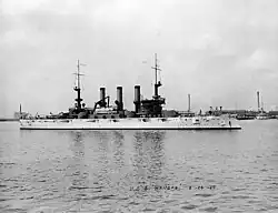 USS Kansas (BB-21) was a US Connecticut-class pre-dreadnought battleship, the fourth of six ships in the class. She was the second ship of the United States Navy named Kansas, but the only one named in honor of the state of Kansas.[a] The ship was launched in August 1905 and commissioned into the fleet in April 1907. Kansas was armed with a main battery of four 12-inch (305 mm) guns and was capable of a top speed of 18 kn (33 km/h; 21 mph).