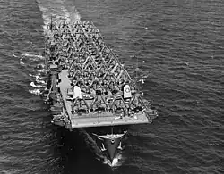 One 5-inch (127 mm)/38 caliber dual-purpose gun was mounted on the stern. Anti-aircraft defense was provided by eight Bofors 40-millimeter (1.6 in) anti-aircraft guns in single mounts, as well as 12 Oerlikon 20-millimeter (0.79 in) cannons, which were mounted around the perimeter of the deck.[4] By the end of the war, Casablanca-class carriers had been modified to carry thirty 20 mm cannons, and the amount of 40 mm guns had been doubled to sixteen, by putting them into twin mounts. These modifications were in response to increasing casualties due to kamikaze attacks. Although Casablanca-class escort carriers were designed to function with a crew of 860 and an embarked squadron of 50 to 56, the exigencies of wartime often necessitated the inflation of the crew count. In a combat situation, Casablanca-class escort carriers were designed to carry 27 aircraft, but an additional number could be accommodated on the hangar deck.[4][5]