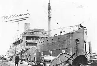 USS Moccasin (ID-1322) was a cargo liner that was launched in Germany in 1903 as Prinz Joachim. The US seized her in 1917. In 1918–19, she was renamed Moccasin and briefly served in the United States Navy. In 1920, she was returned to US merchant service and renamed Porto Rico. She was scrapped in 1933 or 1934.