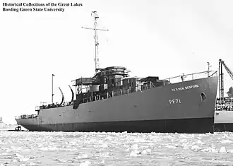 New Bedford (PF-71) was built by the Leathem D. Smith Shipbuilding Company of Sturgeon Bay, Wisconsin, and was launched there on 29 December 1943. She was sponsored by four-year old Cynthia Zeilinski, who at the time was believed to be the youngest sponsor of a fighting ship.[1] New Bedford was towed down the Mississippi River and ferried to Houston, Texas, for completion and fitting out. She was commissioned 18 November 1944.
