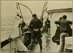 Albatross II made a total of nine scientific cruises during fiscal year 1928 (1 July 1927–30 June 1928), engaging in fishery investigation work in waters from Mount Desert, Maine, to the Virginia Capes.[6] On two of the voyages – one to Massachusetts Bay and one to the area of the North Atlantic Ocean south of Cape Cod, Massachusetts – she conducted tow netting to establish the abundance of eggs and larvae of the Atlantic mackerel and gathered data on water temperatures and currents as part of an investigation under the guidance of Oscar Elton Sette of the biology of the Atlantic mackerel and the factors leading to its success or failure in seasonal spawning.[7][8] In August 1927, she' made a cruise to Georges Bank, where she tagged 940 cod, 24 pollock, and 595 haddock so that their migration patterns could be studied.[7] In March and April 1928 she was on loan to the New York Zoological Society for an expedition to the Galápagos Islands in the Pacific Ocean, where expedition members obtained over 100 Galápagos tortoises, which Albatross II transported to the United States for a breeding program to preserve the endangered species.[6] In the spring of 1928 she made a cruise to the waters of the North Atlantic Ocean off New Jersey to tag cod, pollock, and haddock, but had disappointing results.[7] In all, Albatross II steamed 13,835 nautical miles (25,622 km; 15,921 mi) and tagged 7,417 fish during fiscal year 1928.[6]