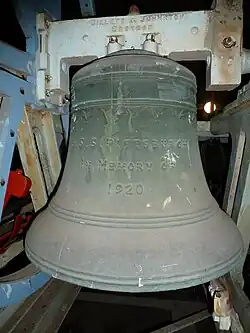 The number 3 bell at Rochester Cathedral, England, bears the inscription "U.S.S. PITTSBURGH IN MEMORY OF 1920".[10] For many years the reason for this inscription was a mystery. Then a researcher found the explanation in the Chatham News of 17 December 1920. That issue included a letter from Captain J. W. Todd, who commanded Pittsburgh in 1920. Todd thanked the dean of the cathedral for various hospitality events during the two and a half months that Pittsburgh was in dry dock at Chatham. He enclosed a cheque for £52 10s to pay for the recasting of the bell and suggested the inscription.[11]