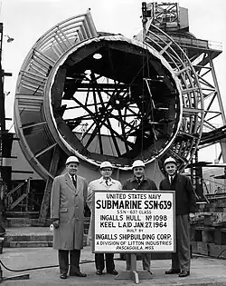 The contract to build Tautog was awarded to Ingalls Shipbuilding in Pascagoula, Mississippi, on 30 November 1961 and her keel was laid down there on 27 January 1964. She was commissioned on 15 March 1967, sponsored by Pauline Lafon Gore, wife of United States Senator Albert Gore, Sr. (1907–1998) of Tennessee.[1] Under sunny skies, a crowd of thousands watched as Mrs. Gore took a hearty swing with a bottle of champagne and intoned the memorial words, "In the name of the United States of America, I christen thee Tautog." Tautog was commissioned 17 August 1968 under the command of Commander Buele G. Balderston.[1]