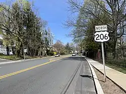 In Princeton, CR 533 intersects US 206, and the two routes run concurrently.[1] The road becomes Stockton Street, passing by the Drumthwacket governor's mansion. US 206 turns north onto Bayard Lane, with Route 27 continuing northeast into downtown Princeton on Nassau Street, which provides access to Princeton University through Princeton Downtown. The stretch from Lawrenceville until the intersection with Nassau Street in Princeton is part of the King's Highway Historic District. Bayard Lane carries the route past more wooded developed areas, eventually curving northeast through a park. Here, US 206 becomes State Road and turns north again.[1][5] Continuing to the north, the amount of development adjacent to the road decreases.[5]