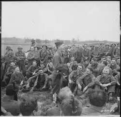 An aggressive defense of the Sarreguemines area was continued throughout February 1945 and most of March. Moving across the Rhine at Worms, 26 March, in the wake of the 3d Division, the 44th relieved the 3d, 26–27 March, and crossed the Neckar River to attack and capture Mannheim, 28–29 March. Shifting to the west bank of the Main, the division crossed that river at Gross-Auheim in early April, and engaged in a 3-week training period. Attacking 18 April, after the 10th Armored Division, the 44th took Ehingen, 23 April, crossed the Danube, and attacking southeast, took Füssen, Berg, and Wertach, in a drive on Imst, Austria. On 2 May, a group of V-2 rocket scientists that included Wernher von Braun surrendered to the 44th.[12] Pursuing the disintegrating enemy through Fern Pass[13] and into the Inn River valley, the 44th set up its CP at Imst on 4 May. After a short period of occupation duty, the division returned to the United States in July 1945 for retraining prior to redeployment, but the end of the Pacific war resulted in inactivation in November 1945 at Camp Chaffee, Arkansas.[2]: 374 [7]: 131 [14]