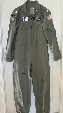 Auxiliarists engaged in aviation activities wear the standard green Nomex one-piece CWU 27/P flight suit worn by military flight crews but with Auxiliary insignia. The Coast Guard considers flight suits to be "organizational clothing" rather than standard uniforms (i.e., clothing issued by local commands for special work situations to be worn in those situations only). Accordingly, they are not authorized outside of conducting flight operations.