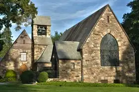 Union Church of Pocantico Hills is a historic, nondenominational church in Pocantico Hills, New York, welcoming all for weekly Sunday services in the Christian tradition at 10:00 am ET. The church was built by John D. Rockefeller Jr. in 1921, as part of his plans to develop the town of Pocantico Hills, which was below his estate Kykuit.[2] Upon the death of Rockefeller's wife Abby Aldrich Rockefeller in 1948, their son Nelson Rockefeller commissioned Henri Matisse to design the church's rose window in honor of her memory shortly before the artist's own death in 1954.[2] When John D. Rockefeller Jr. died in 1960, his children commissioned artist Marc Chagall to design a Good Samaritan window in his honor.[2] It is a one-story neo-Gothic style building with fieldstone foundation and walls and a slate covered, highly pitched gable roof. In 1930–1931, a parish hall was added to the east end of the church.[3]
