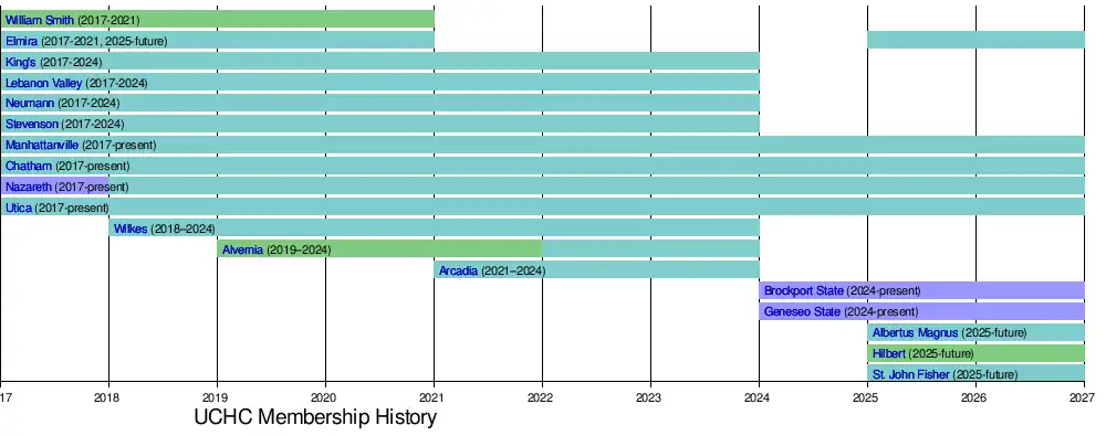 In 2023, the conference was split in two when Misericordia began sponsoring men's ice hockey, allowing the Middle Atlantic Conferences to receive an automatic bid for the NCAA tournament and form a new ice hockey division. In September of that year, Brockport State and Geneseo State announced that their men's teams would be joining the UCHC for the 2024–25, bringing membership back up to eight teams.[6] About a month later, Neumann and Wilkes also announced that they would be leaving the UCHC for MAC as well.[7] This dropped membership back down to six teams, the minimum number of programs required for an at-large bid. A few months later, the conference added four more schools for the 2025 season with Albertus Magnus, Elmira and St. John's Fischer each adding men's and women's hockey while Hilbert's women's team would join.[8]