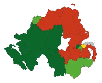 Party seats remained the same as the previous Westminster election in Northern Ireland, with the exception of East Belfast and North Down. The Alliance caused a surprise upset by taking East Belfast from the DUP. The UUP lost its only MP in North Down.[17]