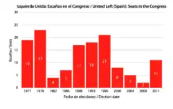 Following the electoral failure of the PCE in the 1982 general election (going from 10% to 4% of the votes), PCE leaders believed that the PCE alone could no longer effectively challenge the electoral hegemony of the Spanish Socialist Workers' Party (PSOE) on the left.[10] With this premise, the PCE began developing closer relations with other left-wing groups, with the vision of forming a broad left coalition.[10] IU slowly improved its results, reaching 9% in 1989 (1,800,000 votes) and nearly 11% in 1996 (2,600,000 votes). The founding organizations were: Communist Party of Spain, Progressive Federation, Communist Party of the Peoples of Spain, PASOC, Carlist Party, Humanist Party, Unitarian Candidacy of Workers, and Republican Left.