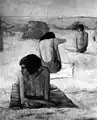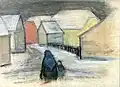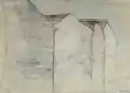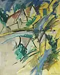 In later years, landscape painting pushed cityscapes and portrait painting to the background. His emerging hearty relationship to Southern Bohemia had a significant influence on this change. The main subject matter of his paintings became the geometrical lines belonging to the village houses' gables. Again and again in never-ending variations he placed blocks and triangles into the magical space of a landscape, out of which he assembled village houses. One can feel a pulsating life behind their walls, but it is hidden, mysterious, often surrounded by a melancholic haze. Having been present to the sad transformation of the traditional village into a heterogeneous hybrid of generic plastering, three-part windows and blocks of flats, he attempted to capture the scenery of stonewalls, baroque gates and dusty paths with flocks of geese, disappearing together with the magic of cleanliness and a feeling of deep belonging to a world of ancient traditions and certainties rising out from the past. His experience of a concrete reality is always supported by a delicate base.
