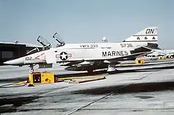 On 1 February 1966, The squadron was again redesignated as Marine All Weather Fighter Squadron 333 (VMF(AW)-333) when they received new all-weather versions of the F-8 Crusader. The squadrons last name change came on 20 June 1966 when they became Marine Fighter Attack Squadron 333 (VMFA-333) as they transitioned to the F-4 Phantom II. On 5 June 1972, VMFA-333 departed Naval Air Station Oceana for a six month deployment on board the USS America (CVA-66). The America arrived at Yankee Station off the coast of South Vietnam on 13 July 1972 and VMFA-333 began flying combat sorties the next day.[2] It was during this deployment that the squadron got its only air-to-air kill when Major Lee T Lasseter, USMC along with his RIO, Capt. John D. Cummings shot down a MiG-21 over North Vietnam, near Hanoi. After the shoot down both aircraft were damaged by flak and an SA-2 SAM, which hit 5526 in the tail section. Close to running out of fuel and with 5526 on fire from the SAM hit, the pilots ejected just south of Haiphong Harbor. The incident was also the first and only all-Marine kill during the Vietnam War. Two other Marines shot down MiGs but they were on exchange with the Air Force.[3] Until 1978 the squadron remained affiliated with Carrier Air Wing 8 and made a 1976 deployment aboard the USS Nimitz (CVN-68). Major Lee T. Lasseter later assumed command of VMFA-333 and was named Marine Aviator of the year for 1972.