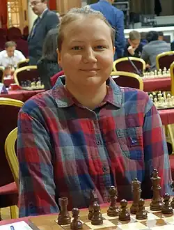 Valentina Evgenyevna Gunina[1] (Russian: Валентина Евгеньевна Гунина; born 4 February 1989)[2] is a Russian chess grandmaster. She is the two-time Women's World Blitz Chess Champion (2012 and 2023), has won the Women's European Individual Chess Championship three times (2012, 2014, 2018), and has won the Russian Women's Championship five times (2011, 2013, 2014, 2021, 2022). She was a member of the gold medal-winning Russian team at the Women's Chess Olympiads of 2010, 2012, 2014, at the Women's European Team Chess Championships of 2007, 2009, 2011, 2015, 2017, 2019 and at the Women's World Team Chess Championship of 2017.