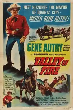 Valley of Fire is a 1951 American Western film directed by John English and written by Gerald Geraghty. The film stars Gene Autry, Gail Davis, Russell Hayden, Christine Larson, Harry Lauter and Terry Frost. The film was released on November 20, 1951, by Columbia Pictures.[1][2][3]