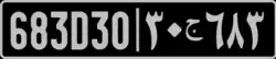 Djibouti requires its residents to register their motor vehicles and display vehicle registration plates.[1] The current version started in 2023 are European standard (520 mm × 110 mm (20 in × 5 in)); black texts on white background; used FE-Schrift typeface for alphanumeric and Square Kufic typeface for Arabic text.[2]