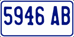 The license plates for private cars (introduced in 1987) follows the format 1234 AB. Coding is not provided. The plates use blue lettering on a white background. For motorcycles, the 1234 A series is valid, also without coding and in a similar color scheme.