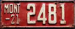 | 1921 | Embossed white serial on maroon plate with border line; "MONT –21" at left | none | 12345 | 1 to approximately 57000 | |