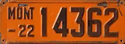 | 1922 | Embossed black serial on orange plate; "MONT –22" at left | none | 12345 | 1 to approximately 55000 | |