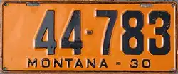 | 1928 | Embossed black serial on orange plate with border line; "MONTANA–28" centered at bottom | none | 123-456 | 1 to approximately 103-000 | First use of the full state name. |
