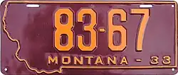 | 1933 | Embossed orange serial on maroon plate with state-shaped border; "MONTANA–33" below serial | none | 12-345 | 1 to approximately 83-000 | |