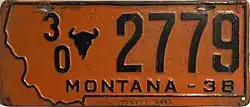| 1938 | Embossed black serial with buffalo skull separator on orange plate with state-shaped border; "MONTANA–38" below serial | none | 1-12345 1/0-1234 | Coded by county of issuance (1 or 1/0) | |