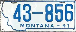 | 1941 | Embossed blue serial on white plate with state-shaped border; "MONTANA–41" below serial | none | 1-12345 10-1234 | Coded by county of issuance (1 or 10) | |