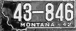 | 1942–43 | Embossed white serial on black plate with state-shaped border; "MONTANA–42" below serial | none | 1-12345 10-1234 | Coded by county of issuance (1 or 10) | Revalidated for 1943 with red tabs, due to metal conservation for World War II. |