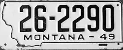 | 1949 | Embossed black serial on white plate with state-shaped border; "MONTANA–49" below serial | none | 1-12345 10-1234 | Coded by county of issuance (1 or 10) | |