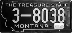 | 1953–54 | Embossed white serial on black plate with state-shaped border; "MONTANA–53" below serial | "THE TREASURE STATE" at top | 1-12345 10-1234 | Coded by county of issuance (1 or 10) | Revalidated for 1954 with silver tabs. |