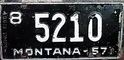In 1956, the United States, Canada, and Mexico came to an agreement with the American Association of Motor Vehicle Administrators, the Automobile Manufacturers Association and the National Safety Council that standardized the size for license plates for vehicles (except those for motorcycles) at 6 inches (15 cm) in height by 12 inches (30 cm) in width, with standardized mounting holes.[1] The 1956 (dated 1957) issue was the first Montana license plate that complied with these standards.