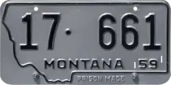 | 1959–62 | Embossed black serial on unpainted aluminum plate with state-shaped border; "MONTANA 59" below serial, stamped "PRISON MADE" beneath state outline | none | 1·12345 10·1234 | Coded by county of issuance (1 or 10) | Revalidated for 1960 with yellow tabs, for 1961 with black tabs, and for 1962 with blue tabs. |
