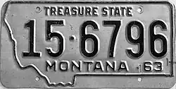 | 1963–66 | As 1959–62 base, but with "MONTANA 63" below serial | "TREASURE STATE" centered at top | 1·12345 10·1234 | Coded by county of issuance (1 or 10) | Revalidated for 1964 with black tabs, for 1965 with blue tabs, and for 1966 with yellow tabs. |
