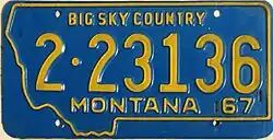 | 1967 | Embossed yellow serial on light blue plate with state-shaped border; "MONTANA 67" below serial | "BIG SKY COUNTRY" centered at top | 1·12345 10·1234 | Coded by county of issuance (1 or 10) | |
