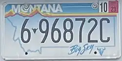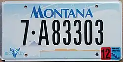 ![]() ![]() | 2012–present | As 1991–2000 base, but with screened black serial with buffalo skull separator | "Big Sky" as on original 1991–2000 base | Replicas of 1991, 2000 and 2006 bases and the optional Montana Centennial plate, issued due to mixed reception of the 2010 blue base. Motorists can choose any one of these five plates. Montana Centennial replicas use the same serial format as current optional plates. New serial font, similar to that used in Arizona, introduced in mid-2016. In 2025, Montana updated the format on standard plates that use the county code format.[4] | ||