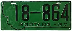 | 1937 | Embossed black serial on green plate with state-shaped border; "MONTANA–37" below serial | none | 1-12345 10-1234 | Coded by county of issuance (1 or 10) | |