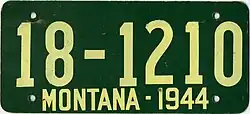 | 1944 | White serial on green fiberboard plate; "MONTANA-1944" centered at bottom | none | 1-12345 10-1234 | Coded by county of issuance (1 or 10) | Manufactured on soybean-based fiberboard due to ongoing metal conservation. |