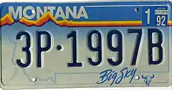 | 1991–2000 | Embossed dark blue serial on reflective sky blue and white gradient plate; white and pale blue state outline screened around plate and yellow, orange and purple band, resembling a mountain range, screened above serial; "MONTANA" screened in white at top left | "Big Sky" screened in sky blue at bottom right, along with a sky blue buffalo skull | 1P·1234A 3P·123AB 10·1234A | Coded by county of issuance (1 or 10) | Letters I, O, Q, R and V not used in serials.[2] Three-digit, two-letter serials briefly issued in Yellowstone County after 3P·9999Z was reached. |