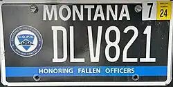 | Montana Concerns of Police Survivors | White serial on black plate; C.O.P.S. logo at left; "MONTANA" in white at top | "HONORING FALLEN OFFICERS" in white within blue band at bottom | ||
