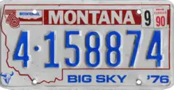 | 1976–91 | Embossed sky blue serial on reflective white plate with screened red state-shaped border; red "76 Bicentennial" logo and sky blue buffalo skull screened at top left and bottom left respectively; red band screened above serial containing "MONTANA" in white; screened sky blue "'76" at bottom right | "BIG SKY" screened in sky blue centered at bottom | 1·123456 10·12345 | Coded by county of issuance (1 or 10) | A straight-line die was originally used for the number '1', before being replaced by a serifed version. |
